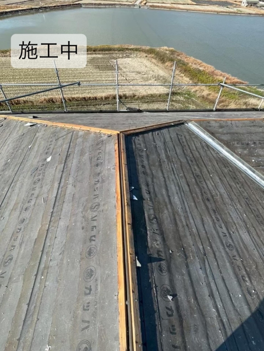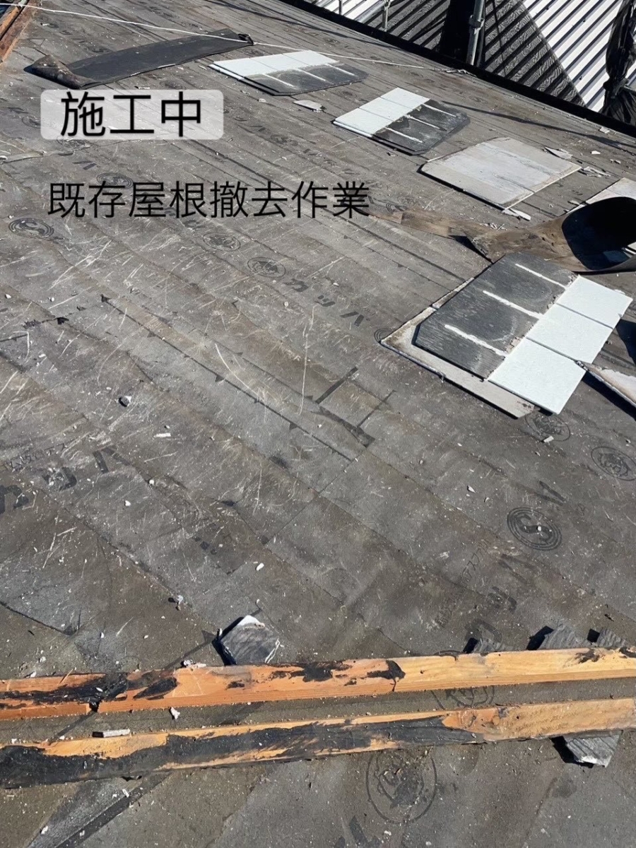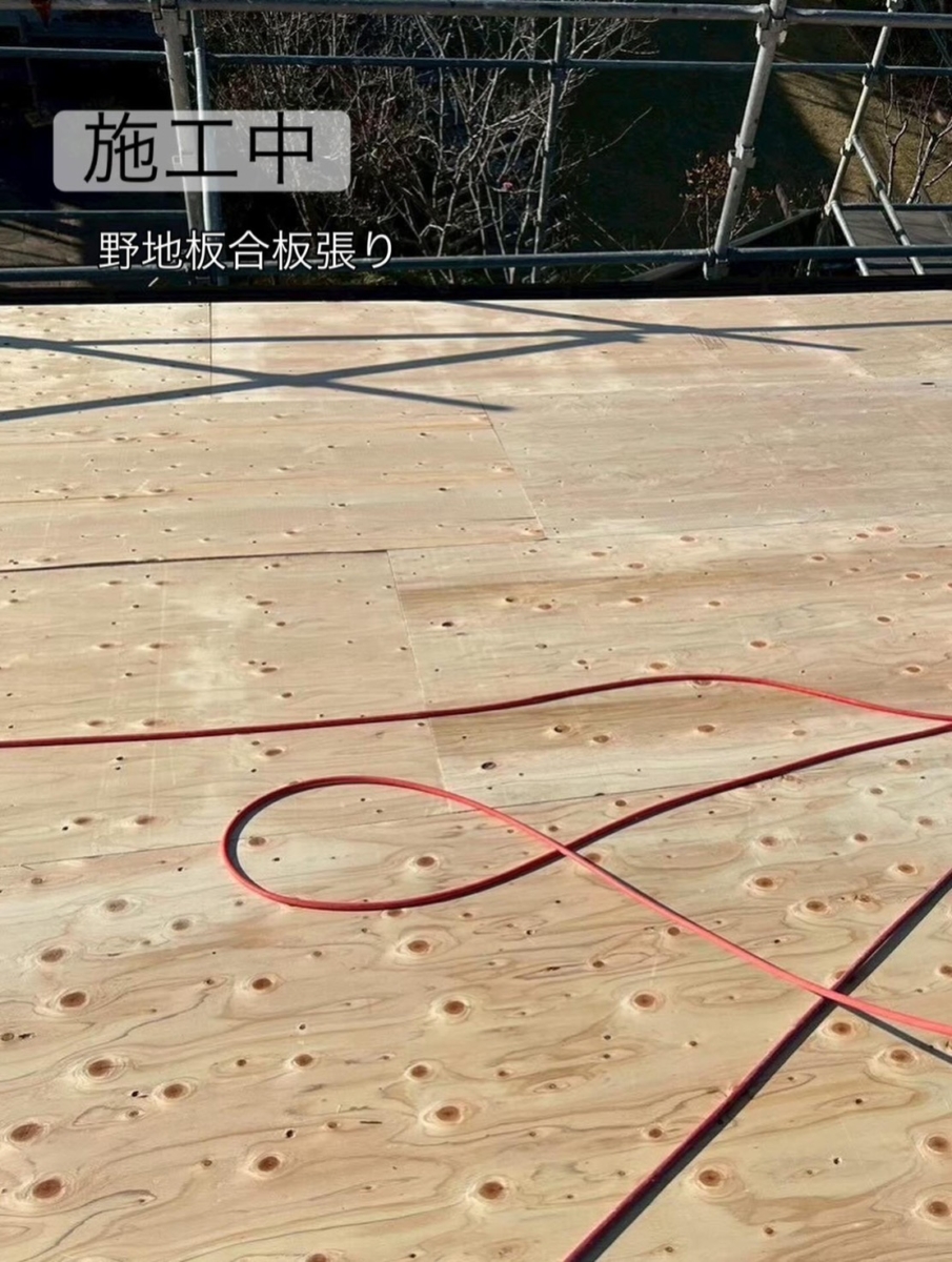 既存ベスト屋根撤去→野地板合板張り→ルーフィング施工→新しい屋根材を張っていくという流れになります。